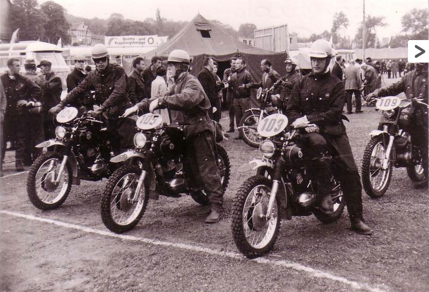 Cierro la reseña con una foto tomada en los ISDT celebrados en Erfurt en 1964. Los pilotos: O. Puig nº 103, F. Lancho nº 105 y R. Costa nº 104 entonces ya con sendas Matador 250. En ese año curiosamente también compitió el actor Stewe Maqueen, que de todos es sabida su afición a las dos ruedas.
