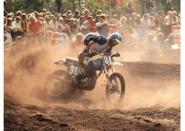Esta foto es copiright de J. Luis Gaillard, y el protagonista es Jim Pomeroy. Lo vemos "batiendo el cobre" en Holanda, en el año 1976. En 2002 la reprodujo el Club Bultaco, para el homenaje que se hizo a este piloto en abril de ese año.