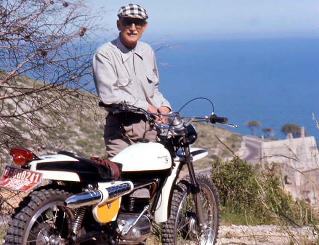 El 17 de mayo de 1912, para bien del motociclismo, tuvo lugar el nacimiento del Sr. Francisco Javier Bultó Marques, "padre" de la marca Bultaco. En consecuencia, este mes de mayo de 2013 se ha cumplido el 101 aniversario de dicho nacimiento. Sirva esta foto de Don Paco junto a una potente El Bandido, en el macizo del Garraf, para recordarle y rendirle homenaje. Además, a esta foto le tengo una especial simpatía, porque el Mar Mediterraneo le da a la imagen un aroma "amable", y también porque puede verse la bodega modernista que proyectó otro genio de la arquitectura, que era Antonio Gaudi.