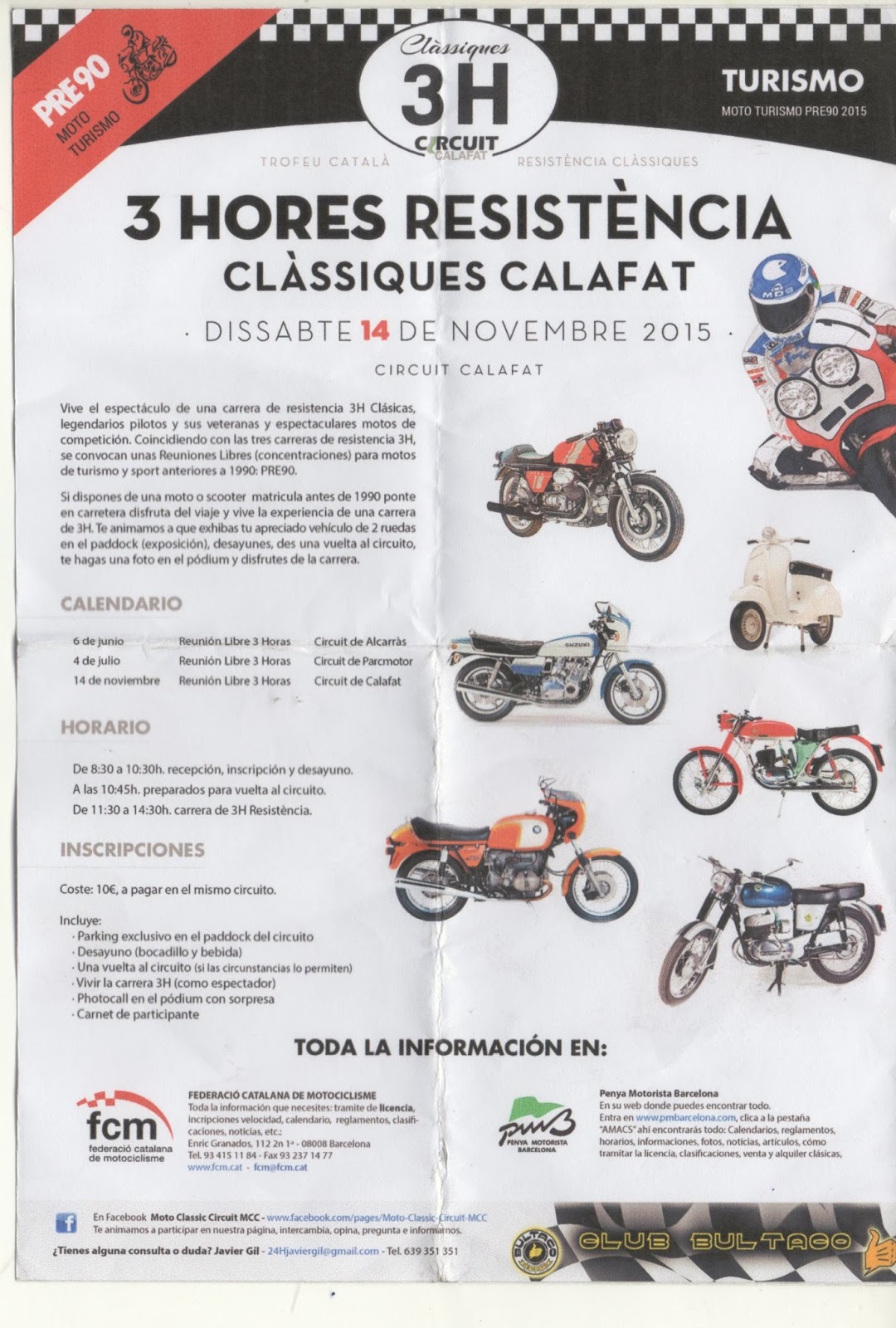 Cualquier excusa es buena para agarrarse a un manillar y hacer kilómetros en moto. Pero aumenta el encanto si a ese objetivo se le añade un destino con ambiente motero. Esta vez fue ver "desde dentro" la celebración de la última carrera del Campeonato de Resistencia de Clásicas 2015, organizado por la Peña Motorista Barcelona, y colaborar en el control del parking-exposición "pre-90"
