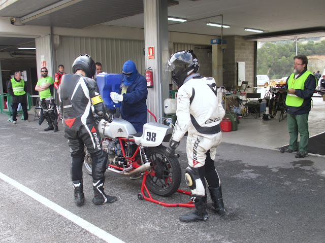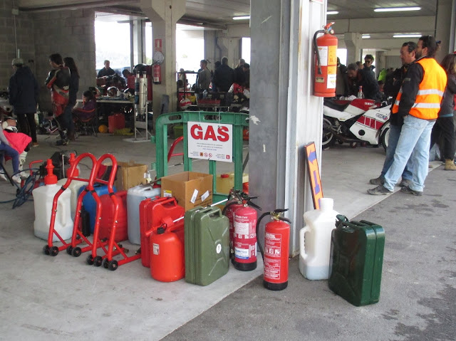 Para finalizar mi crónica, decir que el evento fue un éxito a pesar del mal tiempo reinante, que el ganador absoluto fue el equipo formado por Xavier Arenas / Luís C. Maurel pilotando una Honda CBR 600 F y que bajo unas estrictas medidas de seguridad (como se puede apreciar en estas dos fotos que siguen de un repostaje), se cumplió el programa, cuestión importante...