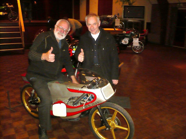 Si es que nuestro colega holandés no para... Aquí le vemos con el piloto mundialista Aalt Toersen, que obtuvo sus mejores resultados en los años 1969 y 1970, y que también fue piloto de las Jamathi, embriones de las Bultaco Monocasco de la categoría de 50 cc. como la que comparte el protagonismo de esta foto.